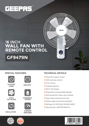 پنکه دیواری کنترل دار سفید جیپاس مدل 9479