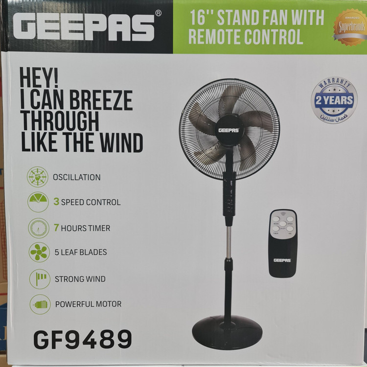 برند جیپاس GEEPAS یکی از عرضه کنندگان لوازم خانگی و برقی است که با بیش از 36 سال تجربه ، در اغلب قاره ها اعم از آسیا و اروپا و آمریکا از استقبال بسیار خوبی برخوردار بوده است.پنکه ایستاده جیپاس مدل GF9489N از انواع پنکه های ایستاده این شرکت است که کیفیت بسیار مناسبی دارد .از مزایای این پنکه دارا بودن حالت های متنوع عملکرد می باشد که مناسب برای زمان استراحت و در شب و یا در شرایط عادی بوده و با فشردن دکمه MODE با قراردادن در وضعیت استراحت در شب ، پنکه بطور خودکار، تغییراتی متناوب در سرعت ایجاد می کند یعنی در مدت چند ثانیه با سرعت بالا کار می کند و بعد از آن برای چند ثانیه سرعت بسیار کاهش پیدا می کند و این عملکرد بطور مکرر انجام می شود که سبب افزایش کیفیت خواب کاربر می شود . این دستگاه پنکه از تایمر با زمان بندی 0.5 تا 7.5 ساعت بهره می برد که نحوه تنظیم آن بسیار مبتکرانه از سوی تولید کننده طراحی شده است با یک بار فشردن دکمه تایمر LED مربوط به نیم ساعت روشن می شود و با فشردن بار دوم این زمان بعلاوه نیم ساعت شده و چراغ 1 ساعت روشن می شود و در فشردن برای سومین بار چراغ 1 ساعت و نیم ساعت روشن می شود و تایم روی 1.5 ساعت قرار می گیرد و به همین ترتیب تا 7.5 ساعت با فواصل نیم ساعته قابل تنظیم است.کلیه کارکردهای پنکه با ریموت آن قابل کنترل است . میله وسط از جنس استیل بوده و از استحکام بالایی برخوردار است و باعث می شود ارتفاع پنکه را بتوان با یک پیچ در پشت آن به 133 سانتیمتر رساند .