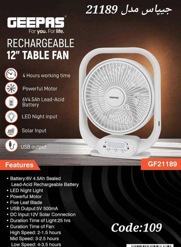 باتری: 6 ولت 4.5 آمپر ساعتی باتری قابل شارژ سرب-اسید مهر و موم شده LED نور شب پرقدرت موتور پنج برگ تیغه USB خروجی: 5 ولت 500 mADC ورودی: 12 ولت اتصال خورشیدی مدت زمان روشنایی: 25 ساعت مدت زمان فن: سرعت بالا: 1.5-3 ساعت: 1.5-2 ساعت - سرعت پایین: 3.5-4 ساعت