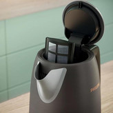 کتری برقی فیلیپس مدل HD9352 دارای بدنه ای از جنس استیل ضدزنگ است و طراحی زیبایی دارد. این کتری با داشتن شبکه های فیلتری کوچک، هر گونه رسوب را از آب میگیرد تا آب جوش آمده از کیفیت بالاتری برخوردار باشد. از نظر ایمنی نیز این محصول دو عملکرد مختلف دارد. قطع کن هنگامی که اب کمی در آن باشد و یا آب به جوش بیاید، عمل میکند و استفاده از آن را بی خطر و ساده می کند. در کتری برقی فیلیپس مدل HD9352 چراغ نشانگری برای نشان دادن روشن/خاموش بودن دستگاه تعبیه شده است. در کنار کتری نیز با وجود نشانگر میزان آب موجود در آن، قابل رویت می باشد. این کتری که توان 2200 واتی دارد، دارای حجم 1.7 لیتری میباشد و در زیر کفی 360 درجه ای آن، محفظه ای برای نگهداری سیم برق تعبیه شده است. در پایان قابل ذکر است که دستگیره این کتری، به صورت ارگونومیک طراحی شده است