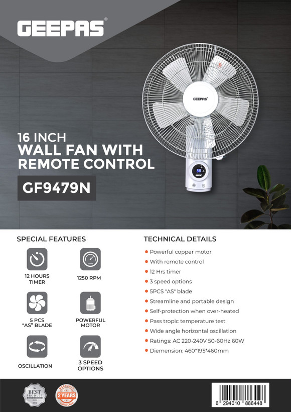 سایر ویژگیها: پروانه 5 پره تنظیم تایمر تا 7.5 ساعتقابلیت تنظیم با سه سرعتسیم پیچی الکتروموتور مسی و پردوامحفاظت شده در برابر افزایش دماگردش به چپ و راست با زاویه بزرگدارای دکمه لمسی بر روی دستگاه علاوه بر ریموت کنترلنمایش زمان تایمر بصورت دیجیتال بر روی پایه دستگاه