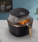 استفاده از رنگهای طلایی – سلطنتی در کنار بخشهای مشکی، جلوهای متفاوت را به فیلیپس na332 بخشیده است. یکی از جالبترین نقاط بدنه دستگاه، همان نوار خاکستری رنگیست که بوسیله یک تلق پلاستیکی مقاوم و ضد حرارت پوشانده شده تا از دریچه تعبیه شده، غذای درحال پخت مشخص باشد. روشن شدن چراغ مخزن دستگاه در هنگام پخت رنگ زردی را به سمت این نوار خاکستری و تلق شفاف هدایت میکند که در نتیجه سرخ کن فیلیپس در هر گوشهای از منزل یا محل کار، تصویری جادویی و خارق العاده را رقم میزند. جالب است بدانید که سیستم پخت این دستگاه از نوع rapid air plus بوده و انتظار میرود کیفیت پخت بهتر و بهینه تری را صورت دهد.